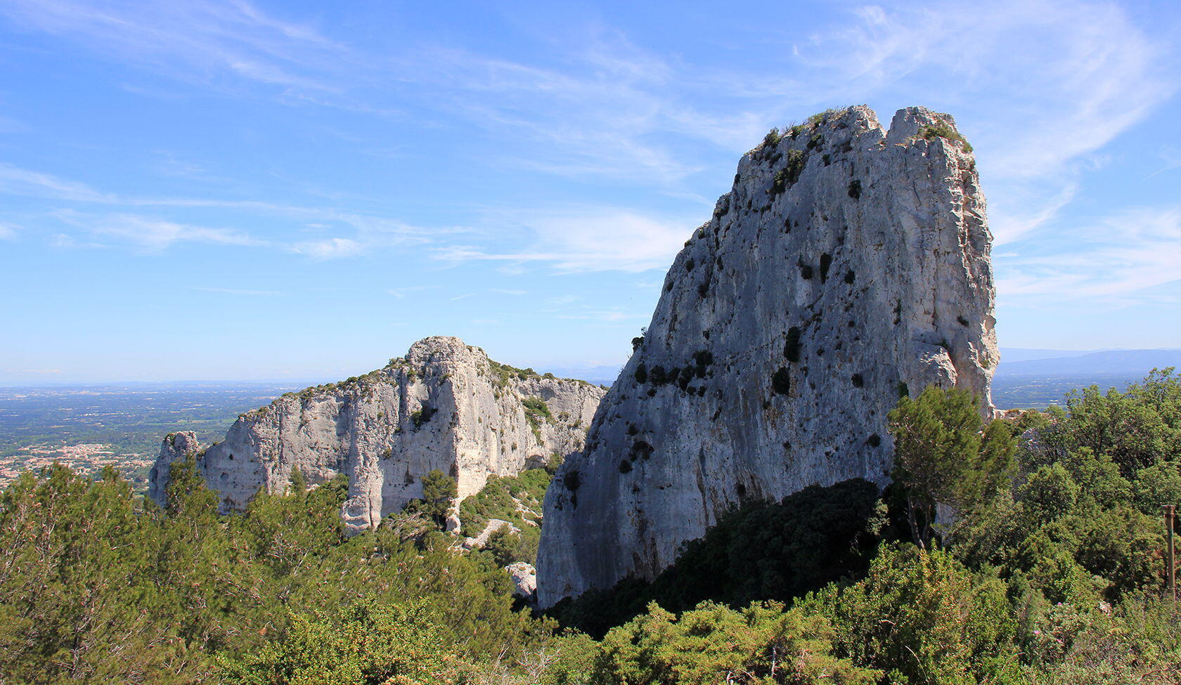 The ruins of a watchtower mark the highest peak in the Alpilles at 496m. There are several options for this hike, which can be completed as an out-and-back or a loop. You can start this walk from Aureille (park near the cemetery – see the location on the map) or Eyguieres (park near Domaine Vallon des Glauges (map view) or the near arena and follow the yellow trail markers.