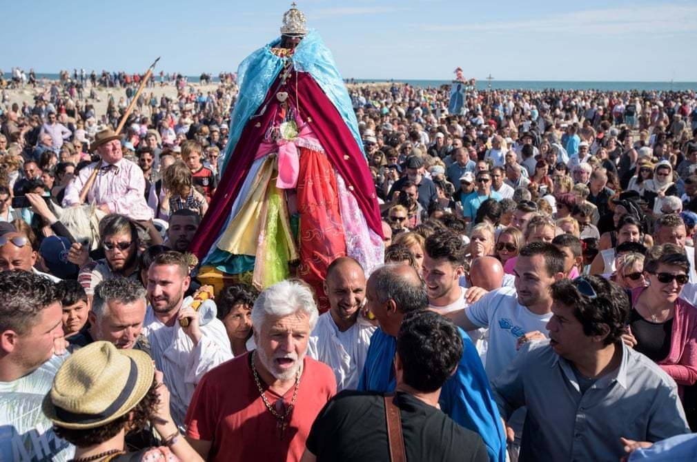 After a rough passage at sea, the ship was miraculously guided to Provence, where it landed at a place now called Saintes-Maries-de-la-Mer (Saints Mary of the Sea). Today the town is a pilgrimage site for the Romani people—also called gypsies—who come to worship their patron Saint Sara, known as “Black Sara” for her dark Egyptian skin. There is a huge procession every year where an icon of the blessed saint is carried into the sea, accompanied by thousands of fervent followers.