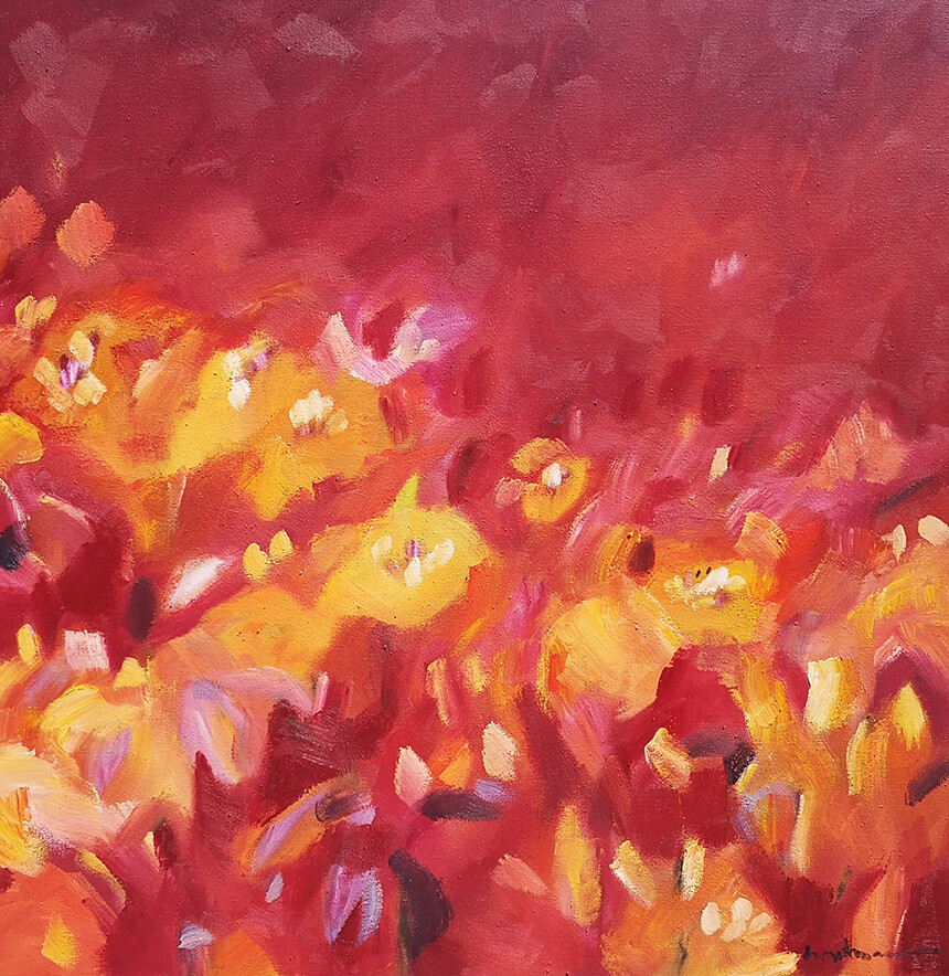 Using various techniques, Hartman paints with oil, watercolours and ochre pigments (from Roussillon). The legacy of famous artists, including Cézanne, Delacroix, Liebermann, Monet, and Rubens inspires her. Provence’s colourful abstract landscapes dominate Hartmann’s work. However, her spiritual journey rises to the surface with her Credo series.