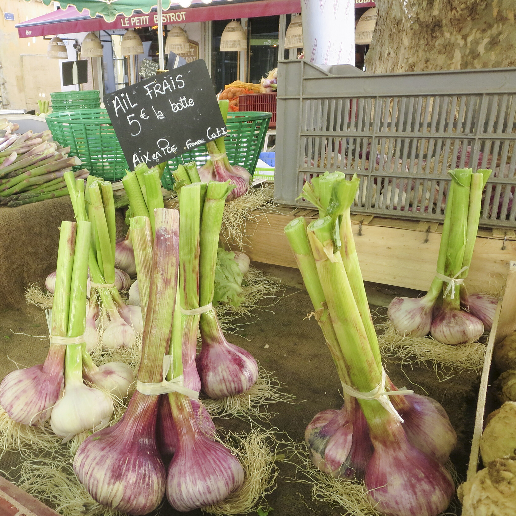 Gaec Les Bougainvillées an Aixois producteur operated by Mary et Loic. You will find them directly opposite L’Unic Bar and Maison Wiebel, on the corner. Their farm is in Aix on the Route de Galice. “Producteur de fruits et légumes sur Aix en Provence depuis 3 générations. Des produits toujours frais ramassés du jour Produits de saisons. Agriculture raisonnée.” They have the only yellow carrots I’ve seen at the market, delicious bagged potatoes, shallots, onions, and the most beautiful garlic braids in season. I like their butternut squash soup and their salads (which I have always called lettuce).